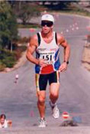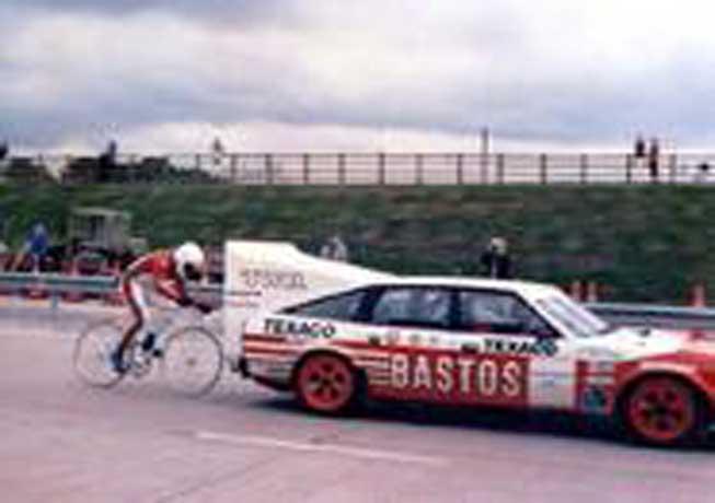 Dave was feeling a little despondent because of an old injury was holding back his sprinting ambitions at World level. Dave broke his spine back in the 1978 Commonwealth Games, and was still suffering from the effects and damaged sustained during a high speed tandem crash. It was here that Dave decided to either quit, or go for a burning desire to go fast, something that Dave has always dreamed of since his childhood. Dave got involved and personally set up a World record attempt for the out -right cycling speed records, on land and on rollers. In 1987, Dave broke the British and Commonwealth Land Speed Record on the M42 motorway with a speed of 110 mph and also in the same year, broke the World record for speed on the rollers at 126 mph live on BBC's Record Breakers Show. This was Dave's final year (for the time being!) and went out winning both the National Professional Sprint and Kierin Titles. He started jogging to keep fit and decided to enter a Marathon for a laugh. Dave recorded 2 hours 58 minutes for the 26 mile run beating some respectable and amazed club runners. Dave competed in 5 Marathons in all, his best effort; 2 hours 38 minutes was in 1991 London Marathon, finishing the in top 200 out of 35.000 competitors. After that Dave decided to compete in Duathlons (run/bike/run) and progressed to 4th in the Vets National Championship and winner of the Eastern region Duathlon Championships.