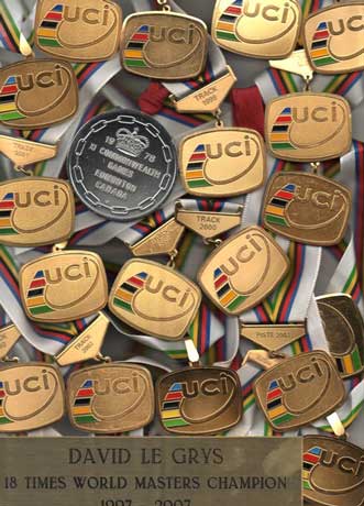 1997 saw the return of now veteran Dave Le Grys, again back on the track winning the World Masters Sprint Championship (40-44 years) at Manchester. In 1999 Dave set out to win 3 Masters World Titles but only won 2 Golds, suffering the indignation of pulling a wheel over in the Semi-Finals of the Sprint event and was not allowed a re-start. The 2 wins were the 750 metre Time Trial and Olympic Sprint, but in 2001, he promised his dieing father he would win those 3 World Masters Titles, and he did, it was a big call, but it goes to show you, when you are determined, you can do it. Since then Dave has won a massive 25 World Masters Gold medals in all, including holding World Records for 750m and 500m. You can't get much better than that, tester, roadie, trackie, marathon runner, Duathlons, National Coach, and organising training camps in Majorca, well you can ! Dave has also represented his country as Coach/Official in the 1992 Barcelona Olympic Games, and representing his country as National Coach in World Championships and World Cup events, and was Rider/Coach/Manager for the famous "Brite" racing team who in that year (1998) won a collective 22 National Titles, and 11 of them with National records. Dave has worked with Rob Hayles and Brad Wiggins, both now have been or are World Champions. Also he has worked with promising youngster Ross Edgar who won Silver and Bronze medals at 2007 Worlds in Majorca and Silver in Beijing Olympics.